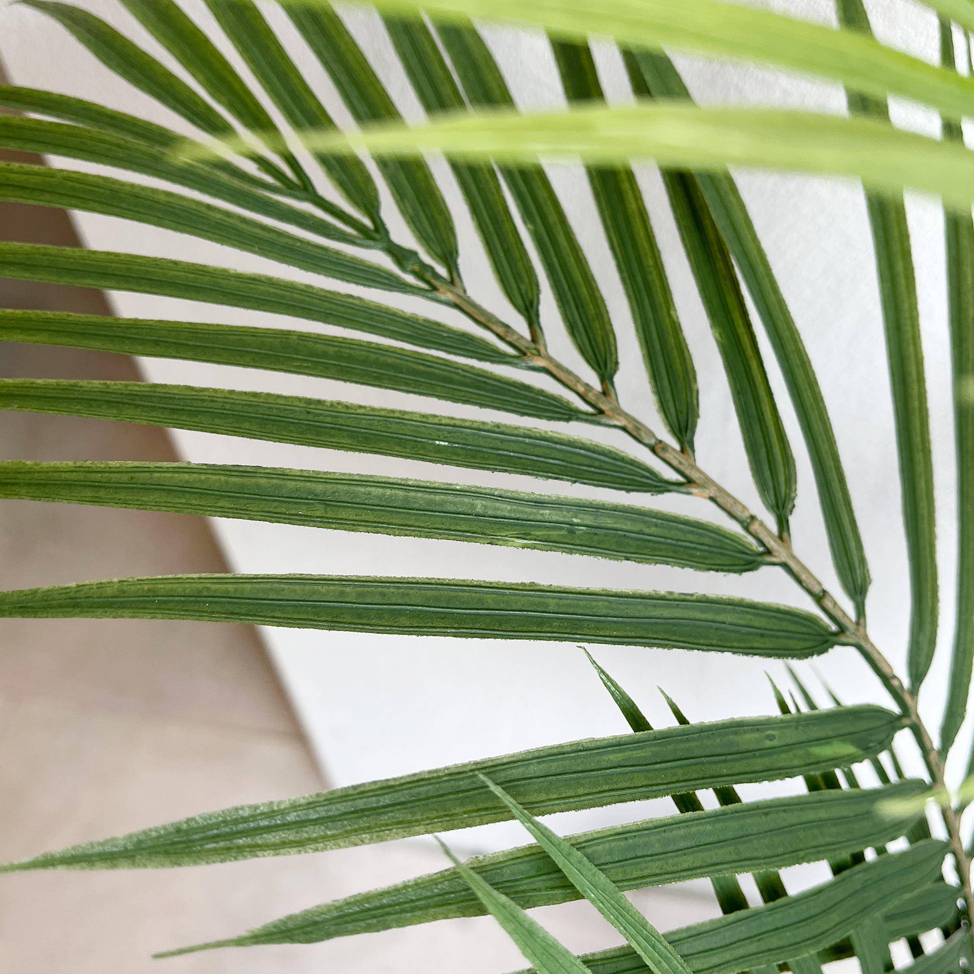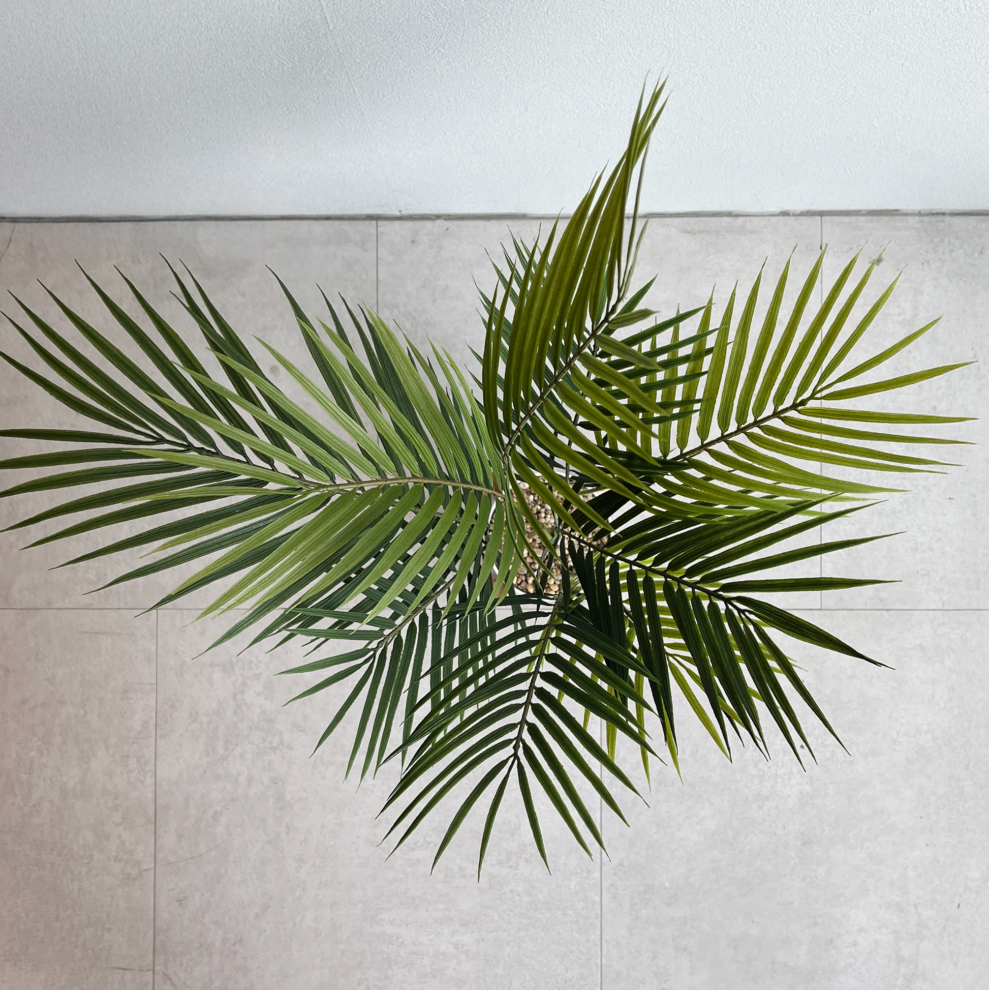 軽やかに広がるアレカヤシの葉が空間に風を運ぶような、爽やかな存在感。「アレカヤシ ナチュラルウッドスタンド」 は、天然木調のスタンドとホワイトポットを組み合わせた、柔らかく上質な佇まいのフェイクグリーンです。