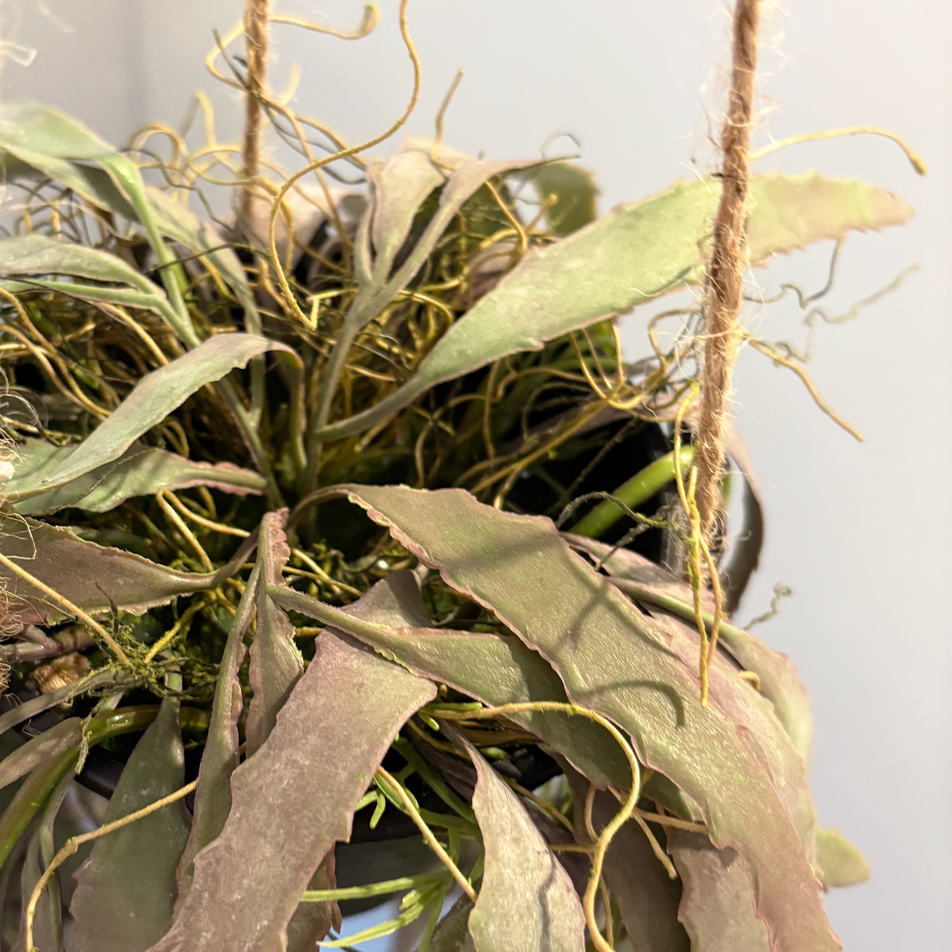 麻紐付きで届いてすぐに飾れる仕様。シンプルなフックやバーに掛けるだけで、手軽におしゃれなグリーンコーデが完成します。ボヘミアンや韓国風、ヴィンテージ調など、さまざまな空間テイストにフィット。暮らしの中に自然のエッセンスを加えてくれる、存在感のあるフェイクグリーンです。