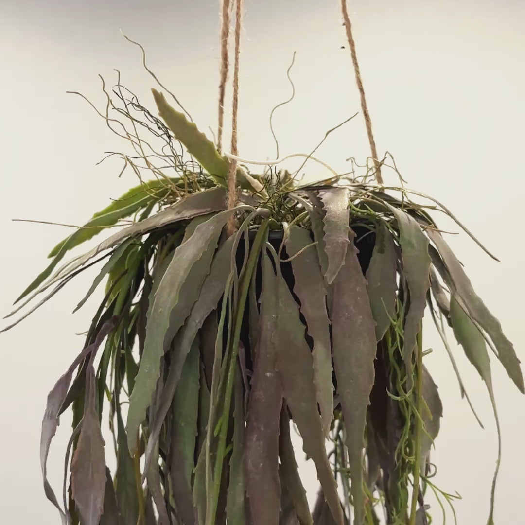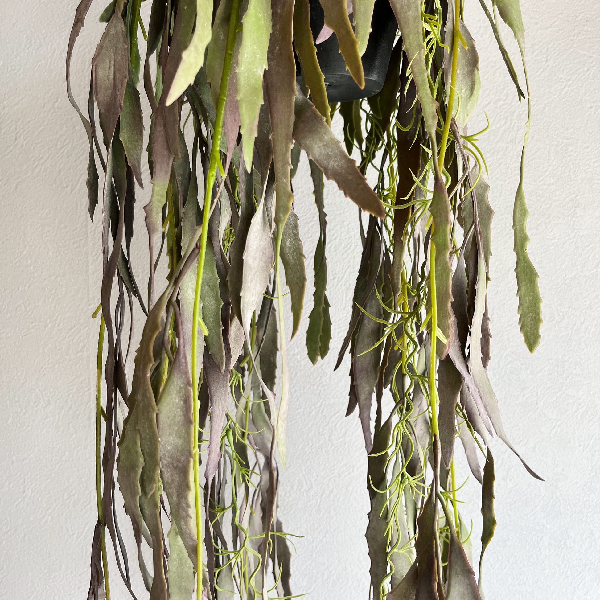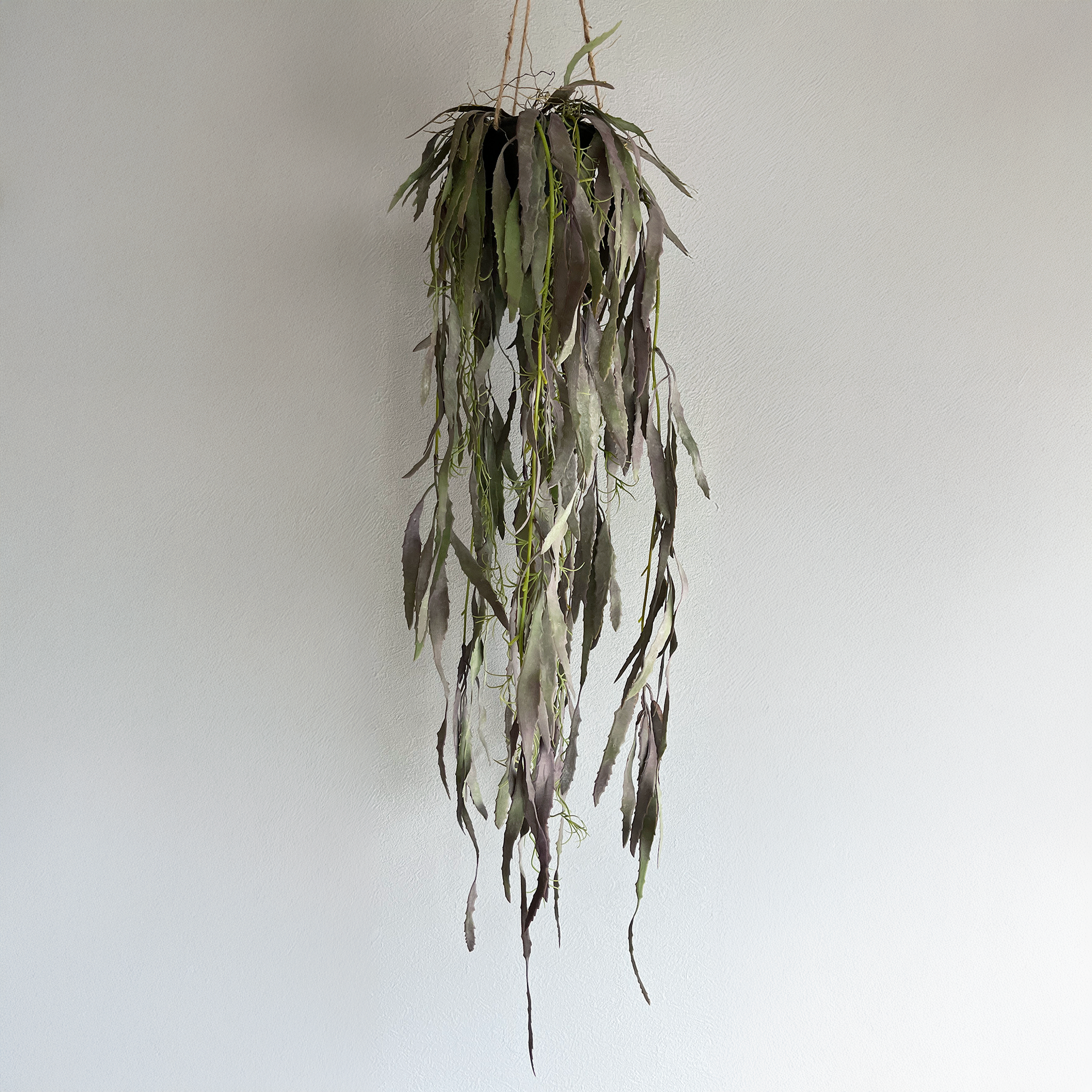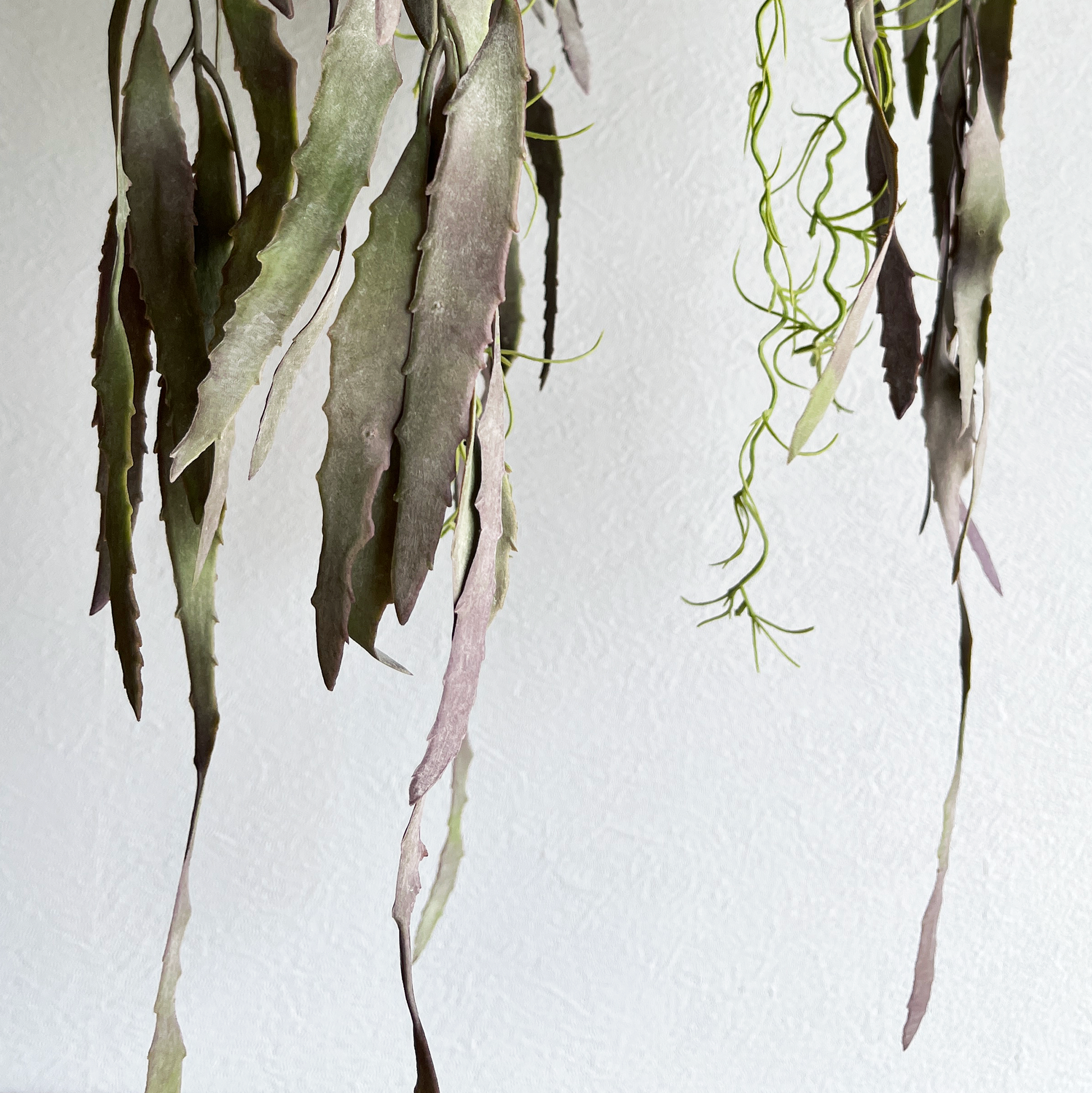 グリーンとパープルが混ざり合った絶妙なくすみカラーが、空間にやわらかく深みのある表情を添えてくれます。しなやかに垂れる葉の流れは、吊るすだけで立体感と動きを演出し、インテリアに抜け感をもたらします。