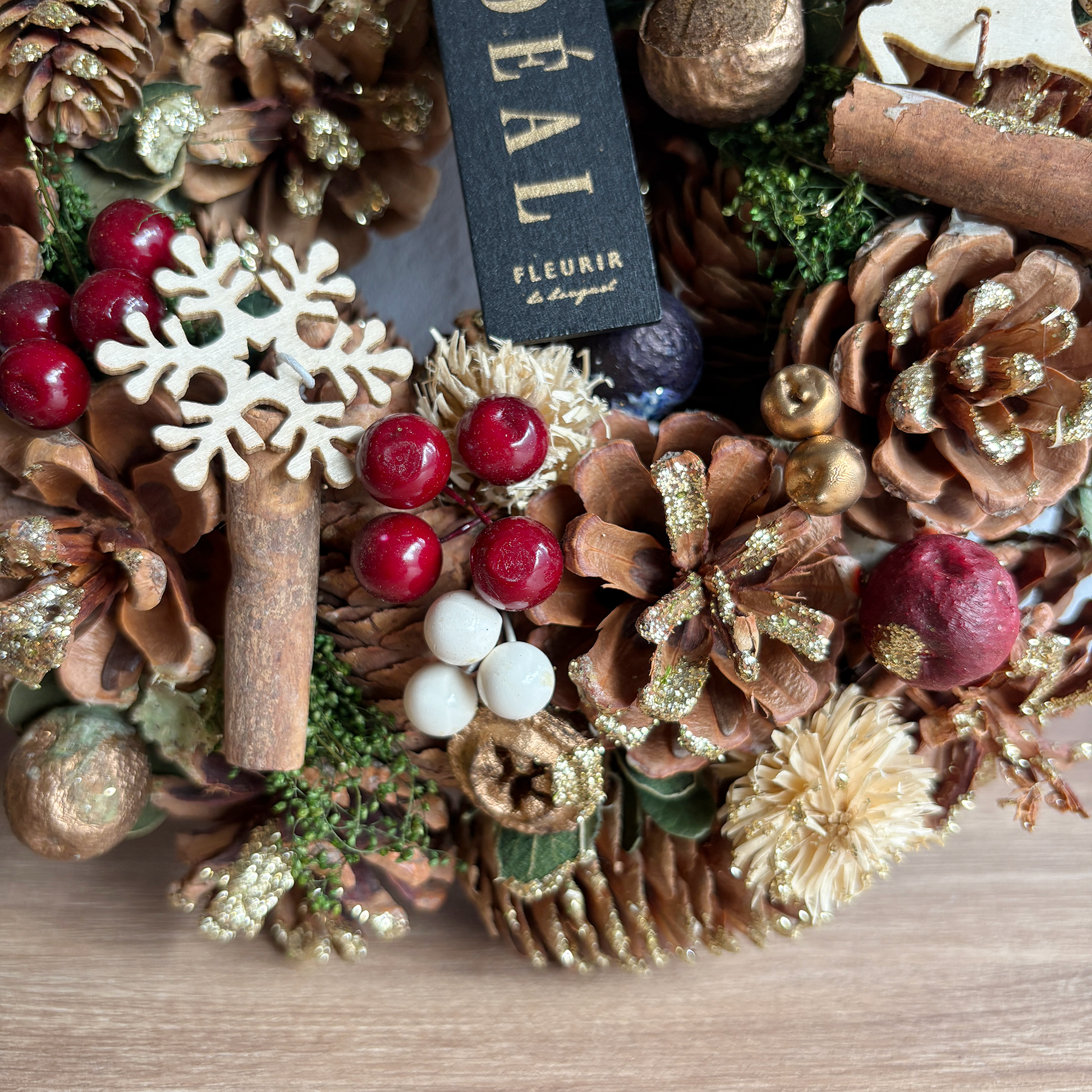 木の実や松ぼっくり、レッドベリーなどをふんだんにあしらった、温もりあふれるナチュラルテイストのクリスマスリースです。玄関ドアやリビング、ショップのディスプレイにもぴったり。落ち着いた色合いながらも、雪の結晶やトナカイのモチーフが季節感をしっかり演出します。